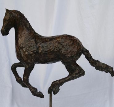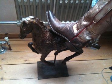 Frozen Fire was the first of my sculptures where I extensively used the internet to build up as complete a picture of my chosen subject as I could find. This horse was foaled in 2005, sired by Montjeu from the dam Flamingo Sea, and went on to win the 2008 Irish Derby. Whether it was the look in his eye, the way he held himself or just his impressive will to win, I just had to try and capture his ‘inner horse’. How to mount the sculpture was slightly tricky: the idea is actually to lose the bronze plate just underneath your lawn so that he just floats there….